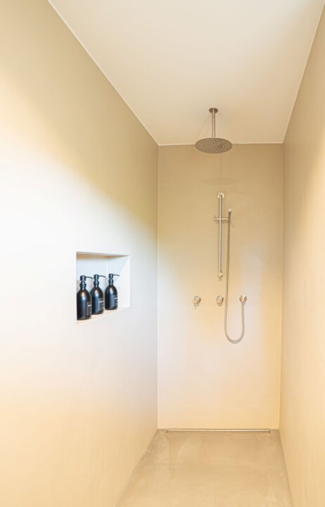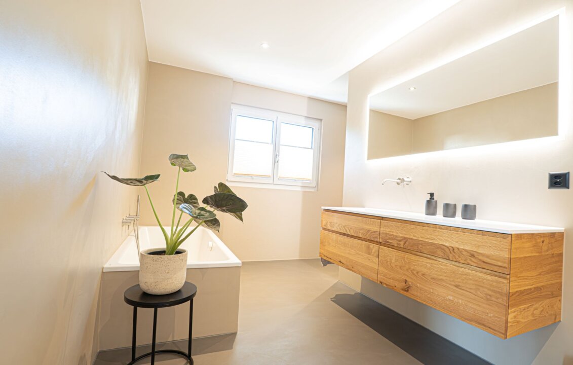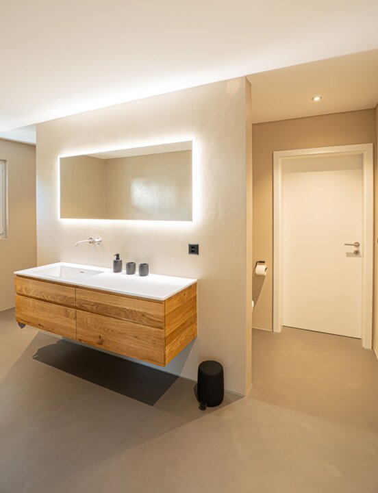 Dieses Badezimmer überzeugt mit einem cleveren Grundriss, der Funktionalität und Ästhetik perfekt vereint. Das zentrale T-Element gliedert den Raum und schafft eine klare Trennung zwischen Dusche, WC und Waschtisch. Es bietet nicht nur den nötigen Sichtschutz, sondern setzt gleichzeitig den massgeschneiderten Waschtisch gekonnt in Szene. Die grosszügige Badewanne fügt sich harmonisch in das Konzept ein und lädt zum Entspannen ein. Dank der durchdachten Planung entstand ein modernes, stilvolles Badezimmer, das höchsten Komfort und ein angenehmes Raumgefühl bietet.